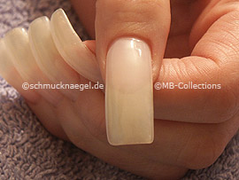 Setzen Sie jetzt die Ecke des kleinen Schwammes rechts auf die Fingernagelspitze und drücken Sie ihn fest auf Ihren Fingernagel.