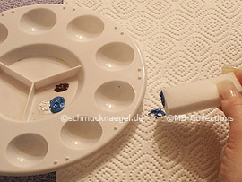 Drehen Sie den kleinen Schwamm so, dass die blaue Acrylfarbe oben liegt. Setzen Sie jetzt die blaue Ecke des kleinen Schwammes auf die Mitte und drücken Sie ihn fest auf Ihren Fingernagel.