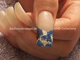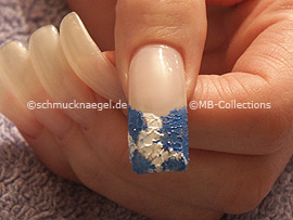Drehen Sie den kleinen Schwamm so, dass die blaue Acrylfarbe oben liegt. Setzen Sie jetzt die blaue Ecke des kleinen Schwammes rechts auf die Fingernagelspitze und drücken Sie ihn fest auf Ihren Fingernagel.