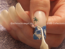 Nehmen Sie mit der Pinzette einen selbstklebenden 3D Nail Sticker in der Form einer Palme auf. Platzieren Sie es auf die braune Acrylfarbe.