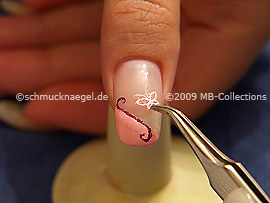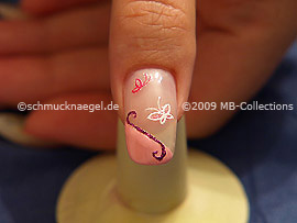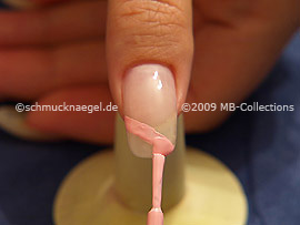 Zeichnen Sie mit dem Nailart Liner in der Farbe pink-glitter eine geschwungene Linie an dem Übergang der freien Fingernageloberfläche und des rosa Nagellackes, ähnlich wie auf den Abbildungen dargestellt.