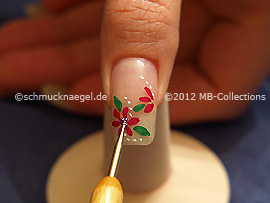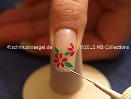 Zeichnen Sie mit dem Nailart Liner in der Farbe grün drei Blütenblätter auf den Fingernagel.