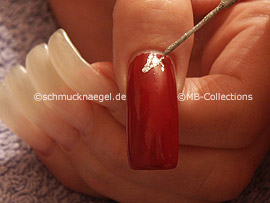 Beginnen Sie in der Mitte am hinteren Fingernagelrand und zeichnen Sie mit dem Nailart Liner in der Farbe silber-glitter, ein etwas nach rechts gekipptes „V“.