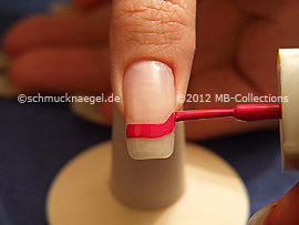 Beginnen Sie am linken Fingernagelrand und zeichnen Sie mit dem Nagellack in der Farbe pink eine Linie zum rechten Fingernagelrand, ähnlich wie auf der Abbildung dargestellt.
