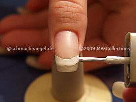 Beginnen Sie an der Smile-Linie und zeichnen Sie mit dem Nagellack in der Farbe weiß eine Linie zum rechten Fingernagelrand, wie auf den Abbildungen dargestellt.