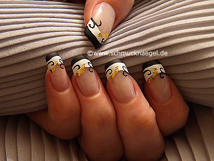 Zeichnen Sie mit dem Nailart Liner in schwarz drei geschwungene Linien auf den weißen Nagellack.