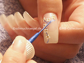 Zeichnen Sie mit dem Nailart Liner in der Farbe blau mehrere geschwungene Linien als Verbindung zwischen den einzelnen Blüten-Motiven.