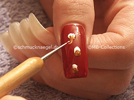 Zeichnen Sie jetzt mit dem Nailart Pen in der Farbe bronze drei große Punkte etwas versetzt auf die zuvor gezeichneten weißen Punkte.