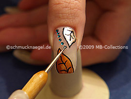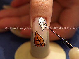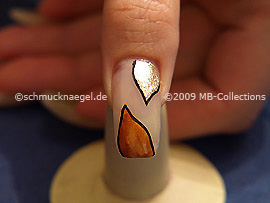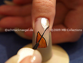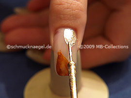 Beginnen Sie am oberen Fingernagelrand und zeichnen Sie mit dem Nailart Liner in der Farbe gold eine ähnliche Form wie mit dem braunen Nagellack.