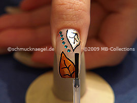 Nach dem Trocknen des Klarlackes ist das Nailart Herbstmotiv mit Strasssteinen fertig.