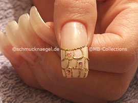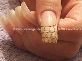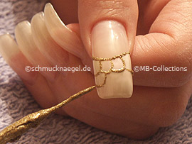 Verwenden Sie jetzt den Nailart Liner in der Farbe gold-glitter. Zeichnen Sie eine Linie an dem Übergang des Nagellackes und der freien Fingernagelfläche.