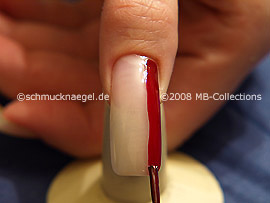 Lackieren Sie den gesamten Fingernagel mit dem Nagellack in der Farbe dunkelrot. Beginnen Sie am hinteren Nagelrand und ziehen Sie den Pinsel nach vorne zur Nagelspitze.
