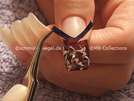 Drücken Sie jetzt mit der Pinzette die V-förmige French Maniküre Schablone fest an Ihren Fingernagel.