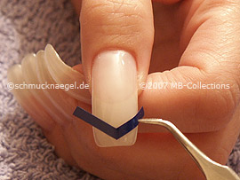 Drücken Sie jetzt mit der Pinzette die V-förmige French Maniküre Schablone fest an Ihren Fingernagel.