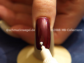 Lackieren Sie den gesamten Fingernagel mit dem Nagellack in der Farbe weinrot. Beginnen Sie am hinteren Nagelrand und ziehen Sie den Pinsel nach vorne zur Nagelspitze.