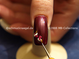Zeichnen Sie jetzt mit dem Nailart Pen in der Farbe rot, leicht versetzt auf die zwei weißen Punkte einen weiteren Punkt in rot.