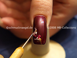 Verwenden Sie den Nailart Pen in der Farbe bronze. Zeichnen Sie leicht versetzt auf die zwei weißen Punkte einen weiteren Punkt in bronze.