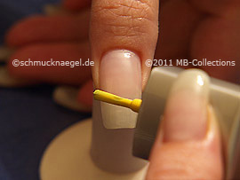 Beginnen Sie am linken Fingernagelrand und zeichnen Sie mit dem Nagellack in der Farbe gelb eine Linie nach unten zum rechten Fingernagelrand.