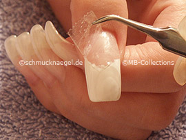 Schneiden Sie ein Stück vom durchsichtigen Klebeband ab und nehmen Sie es mit der Pinzette auf. Kleben Sie jetzt das durchsichtige Klebeband auf Ihren Fingernagel, ähnlich wie auf der Abbildung gezeigt.