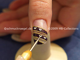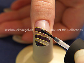 Zeichnen Sie mit dem Nailart Liner in der Farbe gold-glitter eine Linie an den Übergängen der freien Fingernagelflächen und des Nagellackes.