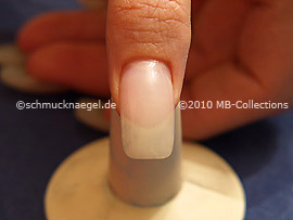 Zeichnen Sie mit dem Nailart Liner in der Farbe weiß eine geschwungene Linie an dem Übergang der freien Fingernageloberfläche und des Nagellackes, ähnlich wie auf den Abbildungen dargestellt.