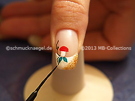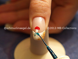 Zeichnen Sie jetzt mit den Nailart Linern in den Farben weiß und rot einen Pilz auf die freie Fingernagelfläche.