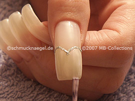 Verwenden Sie jetzt den Nailart Liner in der Farbe silber-glitter. Beginnen Sie wieder an der unteren Spitze der tropfenförmigen Strasssteine und zeichnen Sie eine weitere geschwungene Linie nach unten.