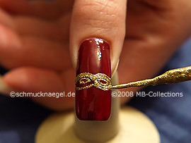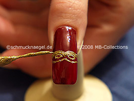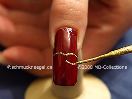 Begin in the centre of the finger nail and draw with the nail art liner in the colour gold-glitter two top curved lines to the right and left fingernail edge.