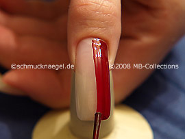 Paint the fingernail with the nail lacquer in the colour dark red. Begin at the rear side of the fingernail and pull the brush forward to the edge of the fingernail.