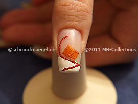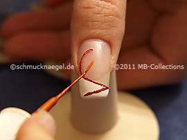 Draw with the nail art liner in the colour red-glitter a long curved line on the free fingernail surface. Be careful not to paint over the white nail lacquer.