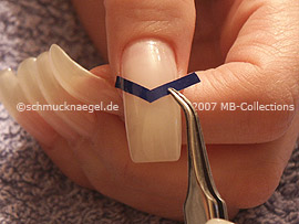 Now press with the tweezers the V-shaped French manicure template firmly on your fingernail.
