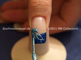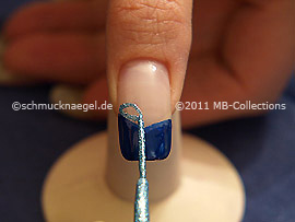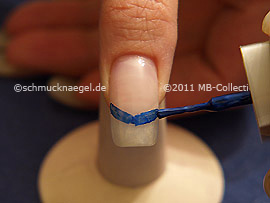 Begin at the left edge of fingernail and draw with the nail lacquer in the colour dark blue a slightly curved line to the right edge of fingernail.