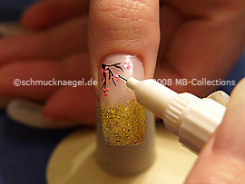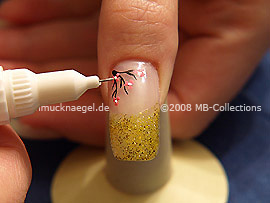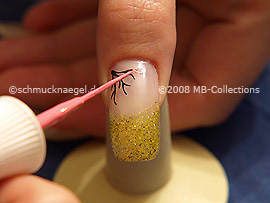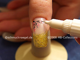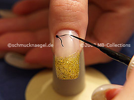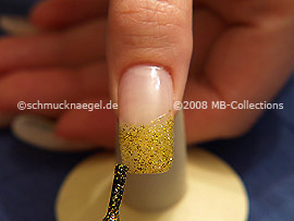 Begin on the left edge of the fingernail and draw with the nail lacquer in the colour gold-glitter a line to the right edge of the fingernail.