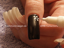Moisten easily the tip of the spot-swirl and take up a strass stone, which should stick to the tip. Now set the strass stone on the damp clear nail lacquer.