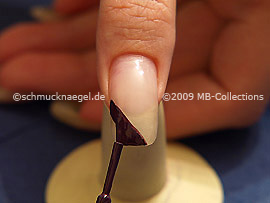Begin on the left edge of the fingernail and draw with the nail lacquer in the colour dark mauve a line to the right fingernail tip.