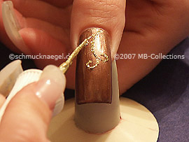 Begin in the center at the rear edge of the fingernail and draw with the nail art liner in the colour gold-glitter a similar sample.