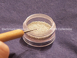 Moisten easily the tip of the spot-swirl or toothpick and dip the tip into the container with the nail art bouillons in silver.