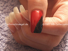 Paint the fingernail with the nail polish in the colour red. Begin at the rear side of the nail and pull the brush forward to the edge of the nail.