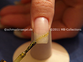 Begin at the right fingernail edge and draw with the nail lacquer in the colour gold-glitter a line down to the left fingernail tip.