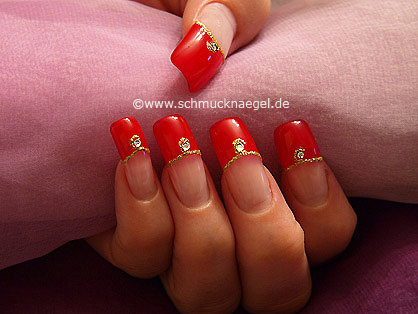 Now draw with the nail art liner in gold-glitter a line at the transition of the free nail surface and the red nail lacquer.