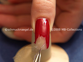 Begin right at the upper edge of the fingernail and paint the free fingernail surface with the nail lacquer in the colour red.
