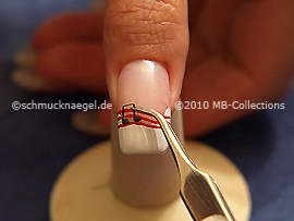 Take up with the tweezers carefully a nail art sticker and stick the sticker on the red lines.