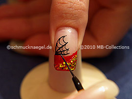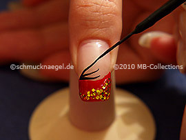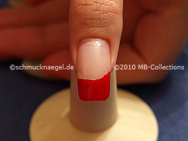 Begin on the left edge of the fingernail and draw with the nail lacquer in the colour dark red a slightly curved line to the right fingernail edge.