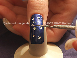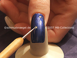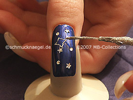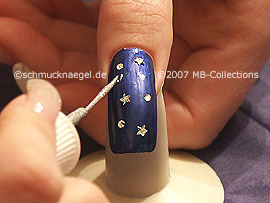 Moisten easily the tip of the spot-swirl or a toothpick and take up a stellar strass stone, which should stick to the tip. Now set the stellar strass stone on the damp nail lacquer.