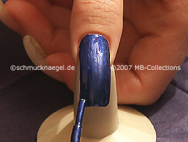 Paint the fingernail with the nail art pen in the colour dark blue. Begin at the rear side of the fingernail and pull the brush forward to the edge of the fingernail.