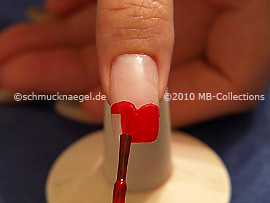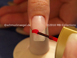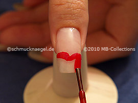Begin at the left edge of the fingernail and draw with the nail lacquer in the colour red a slightly curved line to the middle of the fingernail.