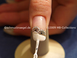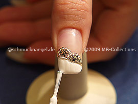Coja con la pinzeta con cuidado la pegatina adhesiva en 3D, pegué ahora la pegatina diagonal sobre la uña.
