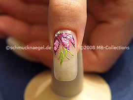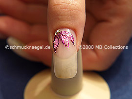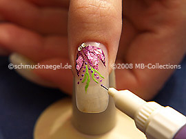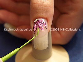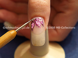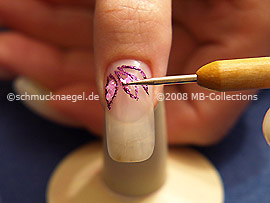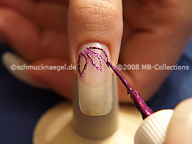 Utilice el nail art liner de color fucsia-glitter. Dibuje una forma ovalada con las puntas cerradas, en el lado izquierdo de arriba en la uña.