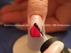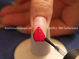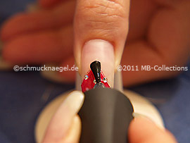 Humedezca el spot-swirl y coja la piedra strass en rojo. Coloque la piedra en el centro de la gota grande del esmalte transparente húmedo, como en la imagen.