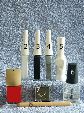 Paso 4: Necesitan el nail art pen en blanco, esmalte transparente y tres piedras strass en cristal